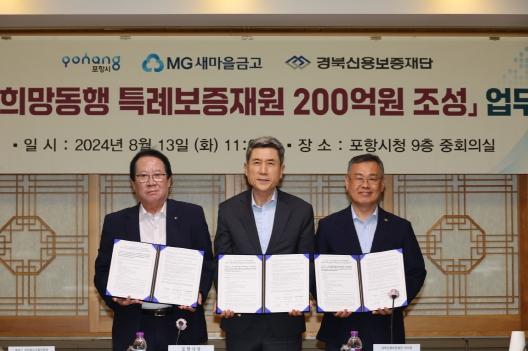포항시는 13일 시청 중회의실에서 포항시 새마을금고협의회와 ‘포항시 소상공인 희망 동행 특례보증재원 200억 원 조성 협약식’을 개최했다.