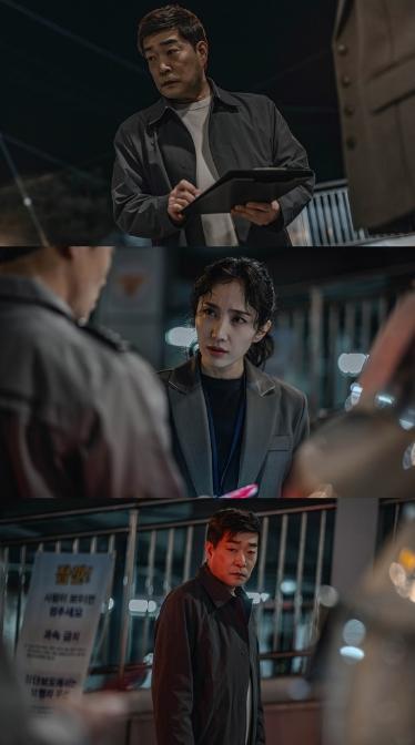 공개된 사진 속에는 무언가 발견하고 심상치 않은 표정을 짓고 있는 장채림 형사의 모습이 담겨있다. 여기에 위험 기류를 감지한 송판호의 얼굴에 드리워진 붉은 조명과 불안한 눈빛이 위태로움을 고조시킨다.