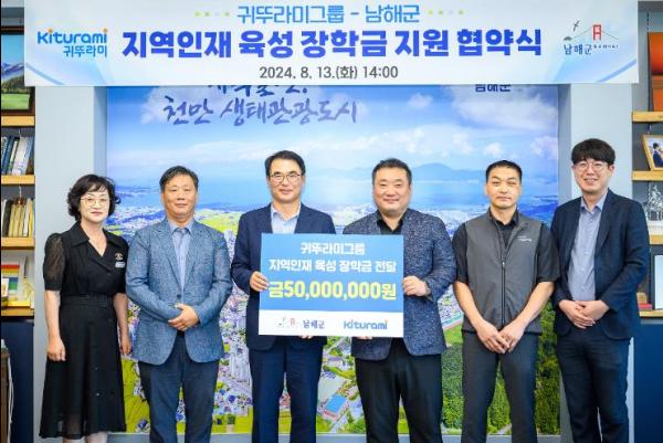 이날 협약식에는 김영준 귀뚜라미 부산지사장을 비롯하여 고재준 남해대리점 대표, 박재준 남해중앙대리점 대표 등 관계자 4명이 참석했으며, 관내 저소득가정 및 복지사각지대 학생들의 학업 장려를 위한 장학금 5,000만 원을 기탁했다.