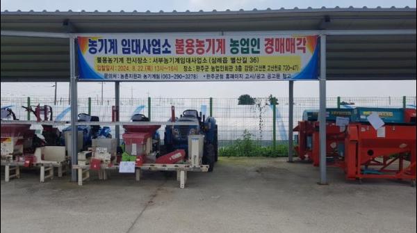 오는 21일까지 삼례 농기계임대사업소(삼례읍 별산길 36)에서 전시한 후 22일 완주군 농업기술센터 농업인회관에서 경매를 거쳐 감정 평가금액 이상 최고가액을 제시한 농업인에게 낙찰한다.