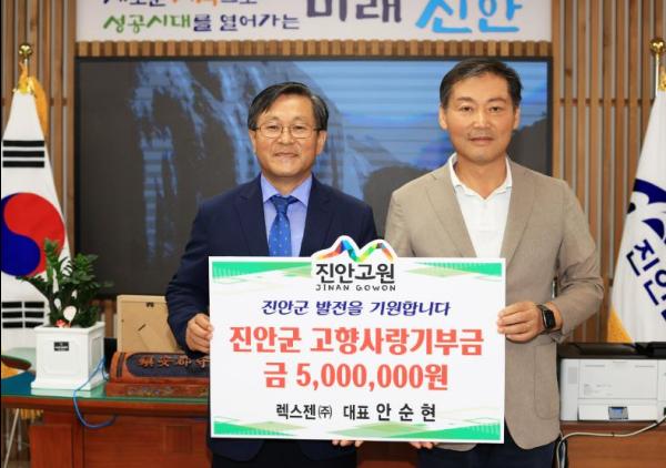 렉스젠㈜ 안순현 대표는 14일 진안군 군수실을 방문해 고향사랑기부금 500만원을 진안군에 전달하는 기탁식을 가졌다.
