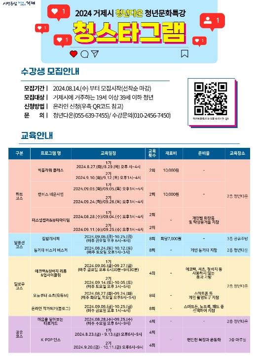 거제시는 아주동에 위치한 청년문화공간 ‘청년다온(거제시 탑곡로 75)’에서 관내 청년들을 대상으로 '2024년 거제시 청년다온 청스타그램 문화 특강 프로그램'에 참여할 수강생을 모집한다고 밝혔다.