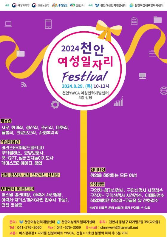 여성가족부, 고용노동부, 충청남도, 천안시가 주관하고 천안여성인력개발센터·천안여성새로일하기센터가 주최하는 ‘천안여성일자리 Festival’이 8월29일 오전10시부터 12시까지 천안YWCA여성인력개발센터 4층 강당에서 개최된다.