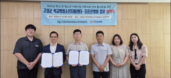 고성군 학교밖청소년지원센터는 지난 8월 13일 더조은병원과 학교 밖 청소년 건강검진 및 연계 지원을 수행하는 협력체계 강화를 위한 업무협약을 체결했다.