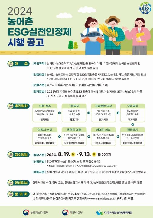 농림축산식품부, 해양수산부, 대·중소기업·농어업협력재단(김영환 사무총장)은 농어촌 환경·사회·투명경영(ESG) 활동에 기여한 우수 기업·기관을 인정하고 홍보하기 위한 ‘2024년 농어촌 환경·사회·투명경영(ESG) 실천인정제’를 시행한다고 밝혔다.