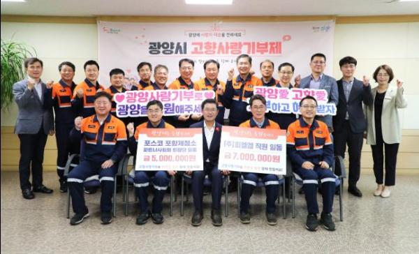 이어 진행된 기부금 전달식에서는 포항제철소 파트너사협회 회장단이 기부금 500만 원을, 포항제철소 파트너사 중 첫 번째로 ㈜피엘엠의 임직원 일동이 광양시에 700만 원을 기부하며 상생발전을 위한 맞손을 잡았다.