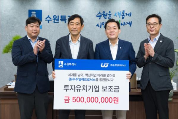 수원시가 민선 8기 4호 유치기업인 ㈜우주일렉트로닉스에 투자유치 보조금 5억 원을 지급했다.