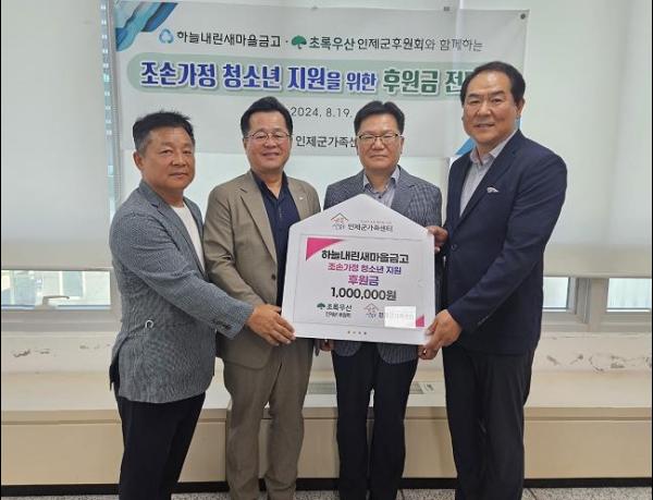 하늘내린 새마을금고와 초록우산 인제군후원회는 인제군가족센터에 조손가정 청소년을 위한 후원금 1백만 원을 전달했다.