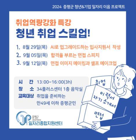 증평군일자리종합지원센터가 ‘청년 취업 스킬업’특강 교육생을 모집한다.