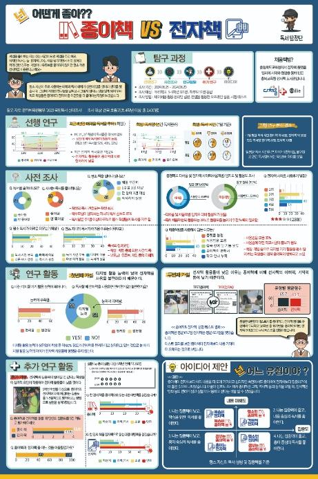 심사결과 초등부 대상은 디지털 기기의 확산과 함께 전자책을 더욱 효과적으로 활용하고자 친구들의 성향별 독서 유형을 제시한 충북 진천상신초등학교의'어떤게 좋아?? 종이책 vs 전자책'이 선정됐다.