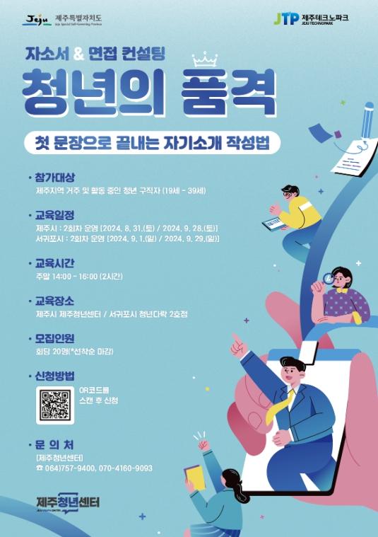 제주특별자치도와 제주청년센터가 2024년 8월 31일 토요일부터 제주청년센터(제주시) 및 청년다락 2호점(서귀포시)에서 취업 청년들을 위한'청년의 품격 : 자소서·면접 컨설팅'교육을 무료로 진행한다.