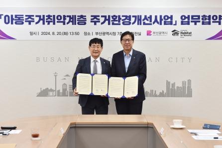 부산시는 오늘(20일) 오후 1시 30분 시청 국제의전실에서 사단법인 한국해비타트와 함께 '아동주거취약계층 주거환경개선사업' 추진을 위한 업무협약을 체결한다고 밝혔다.