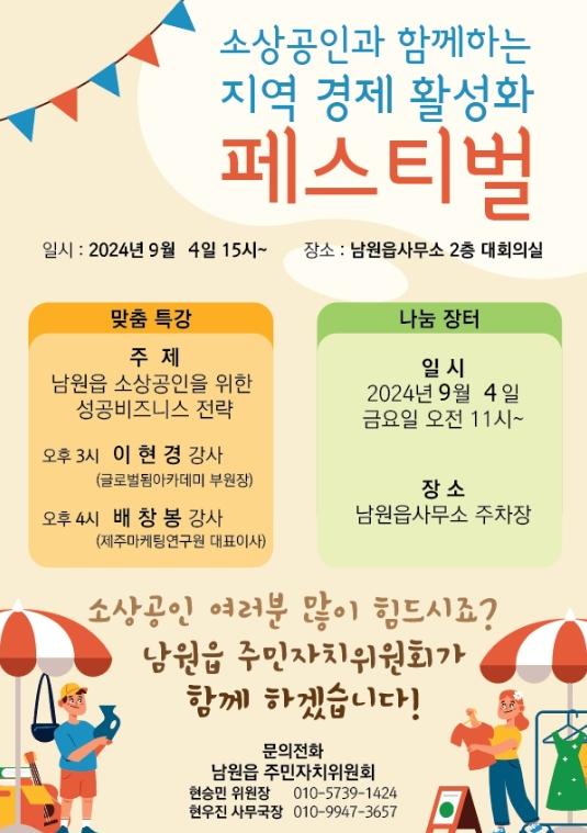 남원읍 주민자치위원회에서 마련한 '소상공인과 함께하는 지역경제 활성화 페스티벌'은 오는 9월 4일 11시부터 남원읍사무소 주차장에서 물품 교환?나눔장터 운영을 시작으로, 오후에는 관내 자영업자 100여 명을 초청하여 그동안의 긴장과 피로를 풀어줄 웃음치료 특강(강사 이현경)과 소상공인 성공비즈니스 전략 맞춤 특강(강사 배창봉)이 진행되며 물품 교환?나눔장터를 통해 얻어지는 수익금은 관내 소상공인과 취약계층을 돕는데 사용될 예정이다.