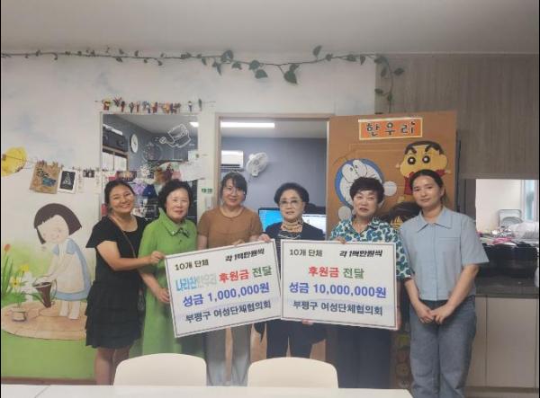부평구는 부평구여성단체협의회가 지난 20일, 21일 이틀 간 지역 내 사회복지 관련 시설 10곳에 각 100만원씩 총 1천만원을 전달했다고 밝혔다.