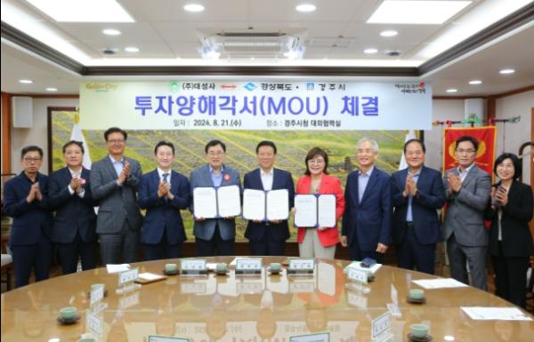 경주시와 경북도는 ㈜대성사와 함께 21일 시청 대외협력실에서 자동차용 신차 차체 부품 생산공장 건립을 내용으로 하는 투자유치 양해각서(MOU)를 체결했다.