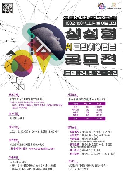 진흥원 김곡미 원장은 “개인의 독창적인 아이디어가 아산과 충청남도를 더욱 다채롭게 만들고, 생성형 AI 기술에 대한 이해도 증진과 창작자 스펙트럼 확대에 도움이 됐으면 한다”며 “기술 기반 문화예술 창작에 관심 있는 분들의 많은 참여를 바란다”고 밝혔다.