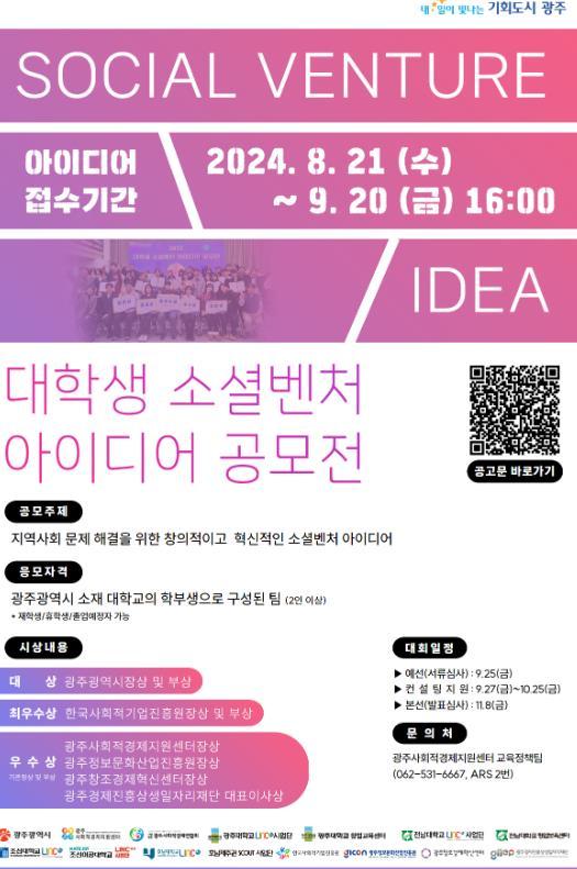 광주광역시는 광주사회적경제지원센터와 함께 지역사회 문제해결을 위한 창의적이고 혁신적인 아이디어 발굴을 위해 ‘제2회 대학생 소셜벤처 아이디어 공모전’을 개최한다.