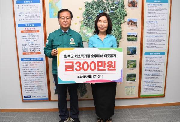 농업회사법인(유)이삭이 완주군에 수해 주민들을 돕기 위해 성금 300만 원을 기부했다.