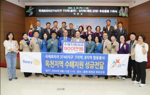 이날 기탁식에는 황선태 총재와 7지역(충주) 김관수 대표, 8지역(제천·단양) 전양숙 대표, 옥천로타리클럽 이용수 회장, 옥천청담로타리클럽 유복여 회장 등 20여 명이 참석해 수해 가구의 일상 회복을 응원했다.