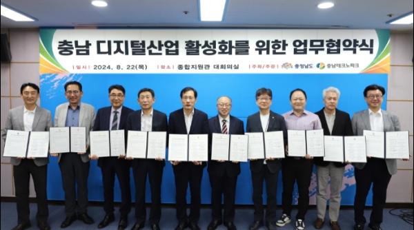 (재)충남테크노파크는 22일 천안 직산읍 소재 충남TP 본원에서 디지털산업을 주도하는 혁신 네트워크를 구성하여 ‘충남 디지털 산업육성을 위한 업무협약식’을 개최했다고 밝혔다.