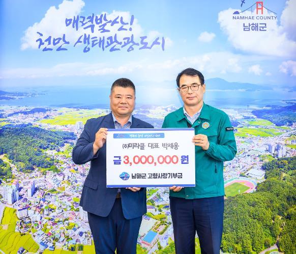남해군은 21일 ㈜미라클 박세웅 대표가 고향사랑기부금 300만 원을 기탁했다고 밝혔다.