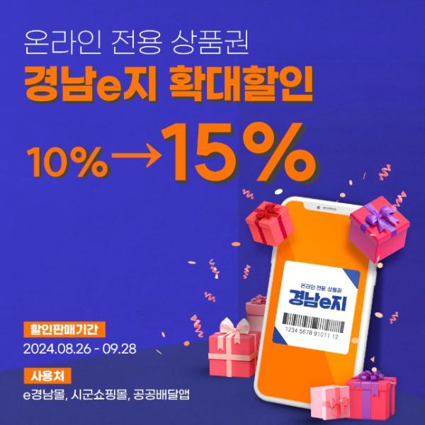 경남도는 추석 장보기 등 소비가 증가하는 시기에 서민물가 부담을 줄이고 소상공인 매출을 늘리고자 온라인 전용 상품권 경남e지를 기존 10% 선할인에서 15%로 확대하여 발행한다.