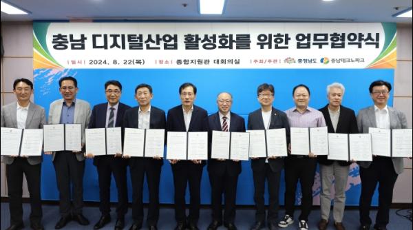 (재)충남테크노파크는 22일 천안 직산읍 소재 충남TP 본원에서 디지털산업을 주도하는 혁신 네트워크를 구성하여 ‘충남 디지털 산업육성을 위한 업무협약식’을 개최했다고 밝혔다.