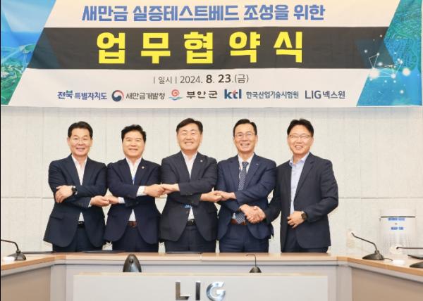 이에 따라 전북자치도와 새만금개발청, 부안군, 한국산업기술시험원, LIG넥스원은 새만금 민·군 겸용 테스트베드 조성을 위해 △민·군 기술교류를 바탕으로 한 연구개발 추진 및 관련 인증체계 구축 △첨단 기술 연구개발과 연계한 테스트베드 활용 및 관련 연구시설 조성 △원활한 사업 추진을 위한 부지 조성 및 관련 행정지원 등 다양한 협력사항을 추진키로 했다.