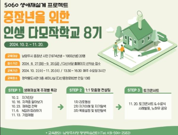 남양주시는 중장년의 새로운 인생 준비와 안정적인 노후생활을 위한 생애 재설계 교육 과정인 인생다모작학교 8기를 접수한다고 23일 밝혔다.