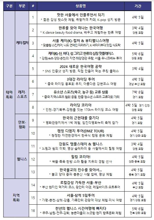 문체부는 한국여행업협회와 함께 중국 단체관광객 유치 전담여행사(이하 중국 전담여행사)를 대상으로 우수여행상품 공모전(7. 15.~29.)을 열어 최종 12개사의 16개 상품을 선정했다. 16개 상품은 케이-컬처 부문 5개, 레저?스포츠 부문 3개, 안보?평화 부문 2개, 치유?휴양(웰니스) 부문 3개, 지역특화 부문 3개다. 대표 상품으로는 ?(케이-컬처) 직접 체험하는 한류로 ‘2024 새로운 한국여행 공략’, ?(레저?스포츠) 생활 체육 동호회?청소년 단체 대상 ‘3대 강 라이딩 투어’, ‘축구?농구 등 유소년 스포츠 교류’, ?(안보?평화) 때 묻지 않은 자연환경과 평화의 역사를 경험할 수 있는 ‘캠핑 디엠지(DMZ) 투어’, ?[치유?휴양(웰니스)] 느림과 쉼의 미학, 사찰에서의 힐링 여행을 경험하는 ‘강원도 템플스테이 & 웰니스’, ?(지역특화) 휴양 목적의 중국 2030 세대를 대상으로 하는 ‘천년의 시간여행에 빠지다’ 등이 있다.