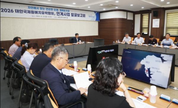 군은 지난 23일 군청 중회의실에서 이주영 부군수와 부서장 등 40여 명이 참석한 가운데 ‘2026 태안국제원예치유박람회 연계사업 발굴 보고회’를 갖고 부서별 발굴 사업을 점검했다.