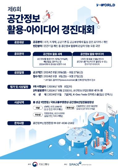 국토교통부는 공공·민간 분야의 공간정보 활용 활성화를 위해 8월 26일부터'제6회 공간정보 활용·아이디어 경진대회'(이하 경진대회)를 공고하고 9월 9일부터 참가신청서를 접수한다.