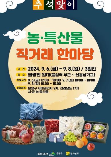 은평구는 추석 명절을 맞이해 내달 6일부터 8일까지 3일간 추석맞이 농·특산물 직거래 한마당을 응암역부터 신흥상가교까지 불광천 일대에서 개최한다고 밝혔다.