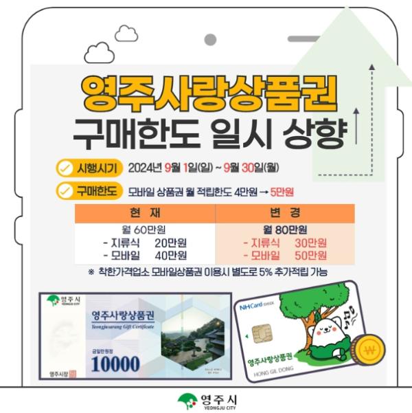 시는 가계경제 부담을 줄여 추석 명절을 풍성하게 맞이할 수 있도록 9월 영주사랑상품권 개인 구매 한도를 지류상품권은 기존 20만 원에서 30만 원으로, 모바일상품권은 기존 40만 원에서 50만 원으로 늘린다.