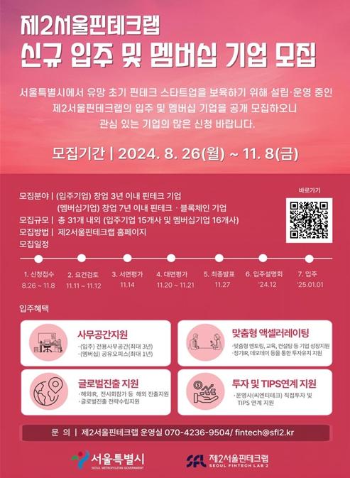 서울시는 ‘제2서울핀테크랩’(마포구 도화동)에 입주할 유망 핀테크 스타트업(멤버십 기업 포함) 31개사를 8월 26일부터 11월 8일까지 모집한다고 밝혔다.