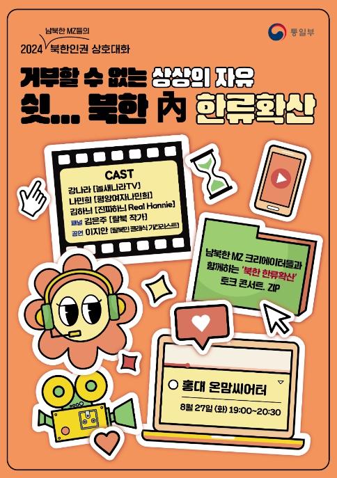 통일부는 8월 27일 오후 7시부터 홍대 온맘씨어터에서 ‘거부할 수 없는 상상의 자유, 쉿... 북한 내 한류 확산’을 주제로 ‘제2차 북한인권 상호대화’를 개최한다.
