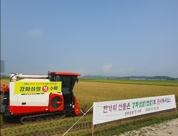 강화군이 지난 25일, 교동면 삼선리 최복환 농가에서 강화섬쌀 첫 벼 베기를 진행하며 수확 철의 시작을 알렸다.