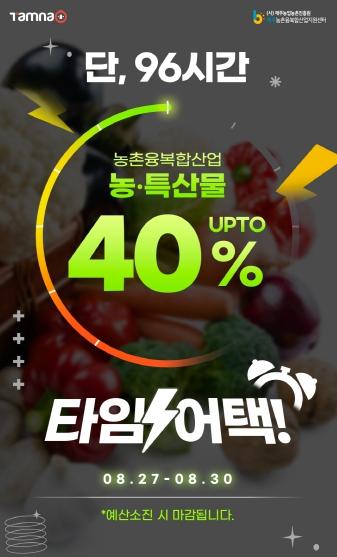 제주농촌융복합산업지원센터와 제주특별자치도관광협회에서 운영하는 제주여행 공공플랫폼 탐나오 가 탐나오 사이트 內‘제주 농부의 장’카테고리 농·축·특산물을 8월 27일부터 8월 30일까지 단 96시간 동안 최대 40% 할인하는 “제주농촌융복합산업 농특산물 타임어택 프로모션”을 진행한다. (예산소진시 마감)