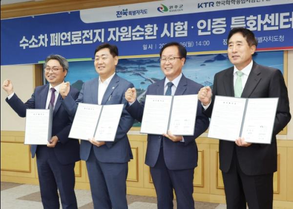 전북특별자치도와 완주군, 한국화학융합시험연구원(KTR), 우석대학교는 업무협약을 맺고 수소차 폐연료전지 자원순환 관련 산업 육성을 위해 힘을 모으기로 했다.
