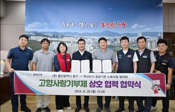 울산 중구와 혁신도시 공공기관 노동조합 협의회가 8월 26일 오후 3시 중구청 구청장실에서 고향사랑기부제 활성화를 위한 ‘고향사랑기부제 상호 협력 협약’을 체결했다.