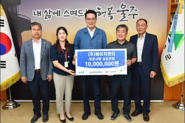 ㈜에이치앤티가 26일 울주군청 소회의실에서 이순걸 군수와 ㈜에이치앤티 고기한 대표, 사회복지공동모금회 울산지회 관계자 등이 참석한 가운데 울주군 저소득세대를 위한 성금 1천만원을 전달했다.