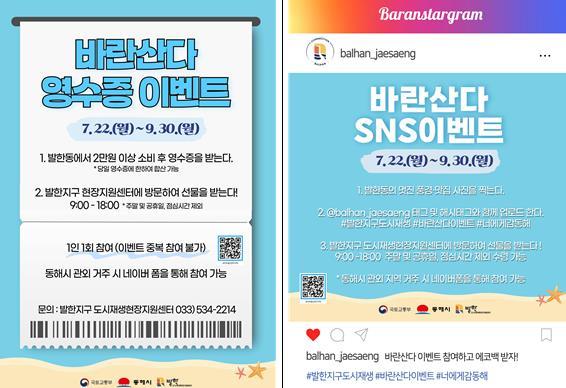 이번 이벤트에 응모하고자 하는 사람은 첫 번째는 발한동 내 상권 소비를 유도하여 지역 경제 활성화에 긍정적 영향을 기대하며 기획한 ‘영수증 이벤트’로 발한동 내에서 2만원 이상 소비한 영수증을 증빙하면 되고