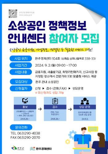 소상공인 정책정보 안내를 받고자 하는 소상공인은 완주군청 홈페이지(소통참여→군정소식→축제, 교육/모집)를 참고하거나 완주경제센터에 문의하면 된다.