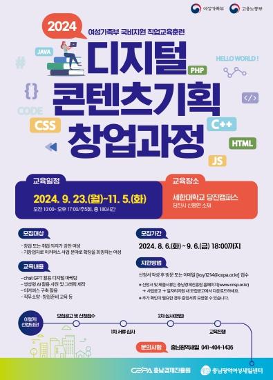 (재)충남경제진흥원 충남광역여성새로일하기센터에서는 도내 여성의 직업능력 개발 및 취·창업 역량 강화를 위해 2024년 여성가족부 지원'디지털콘텐츠 기획 창업과정'직업교육훈련을 실시한다고 밝혔다.