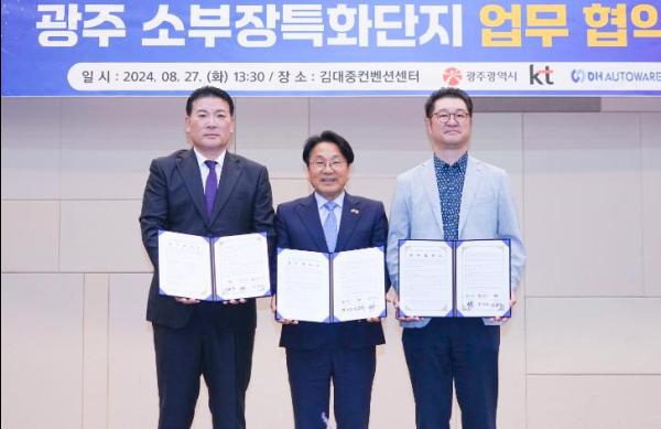 광주광역시는 27일 김대중컨벤션센터에서 광주 자율주행차 소부장(소재?부품?장비) 특화단지 성공 추진을 위해 선도기업인 ㈜DH오토웨어, KT와 업무협약을 체결했다.