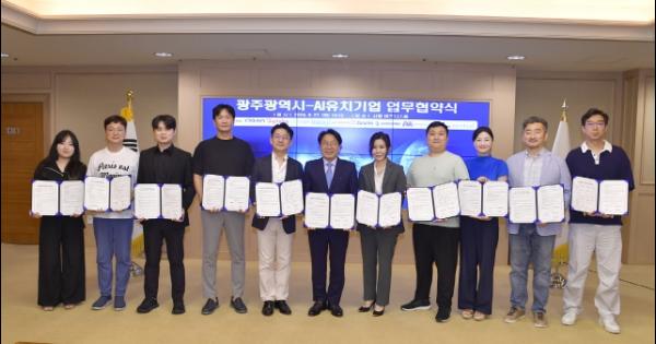 광주광역시는 27일 시청 비즈니스룸에서 클라이온, 디지털로그 테크놀로지스, 바이오컴, 인이지, 써로마인드, 두루미스, 정션메드, 엠 코포레이션, 헬프티쳐, 레스트오브 등 플랫폼?헬스케어?콘텐츠 등 다양한 분야의 인공지능(AI)기업 10개사와 204~213번째 업무협약을 체결했다.