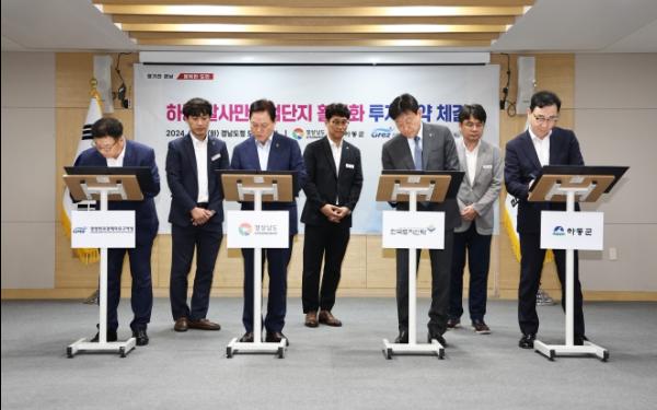 이날 협약식에는 박완수 도지사를 비롯해 최윤성 ㈜한국토지신탁 부회장, 하승철 하동군수, 선양규 광양만권경제자유구역청장 직무대리가 참석한 가운데 진행됐으며, 도는 이번 투자협약을 통해 장기간 표류하던 하동 갈사만 산업단지를 정상궤도에 올릴 수 있을 것으로 기대한다.