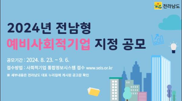 전라남도는 2024년 전남형 예비사회적기업 지정을 희망하는 기업을 오는 9월 6일까지 공모한다고 밝혔다.