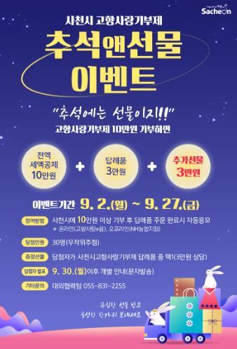 사천시는 민족 대명절 추석을 맞아 오는 9월 2일부터 27일까지 고향사랑기부제 참여자를 대상으로 ‘추석 앤 선물 이벤트’를 진행한다고 밝혔다.
