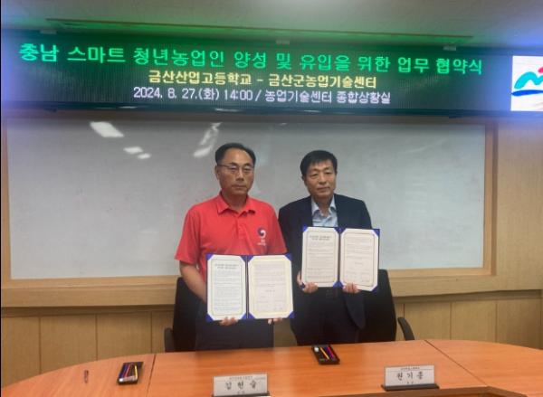 금산군농업기술센터는 지난 27일 센터 종합상황실에서 금산산업고와 지역 내 청년농업인 양성 및 유입을 위한 업무협약을 체결했다.